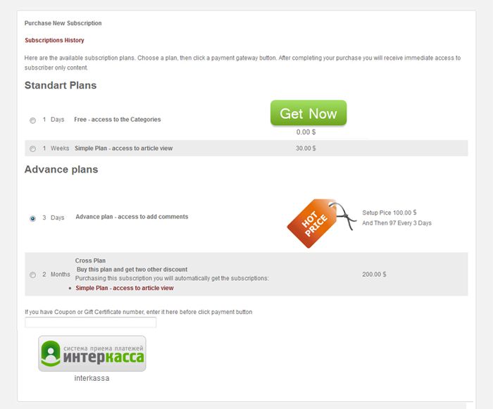 With this payment plug-in, users will be able to buy subscriptions to your site, paying for them via Interkassa.